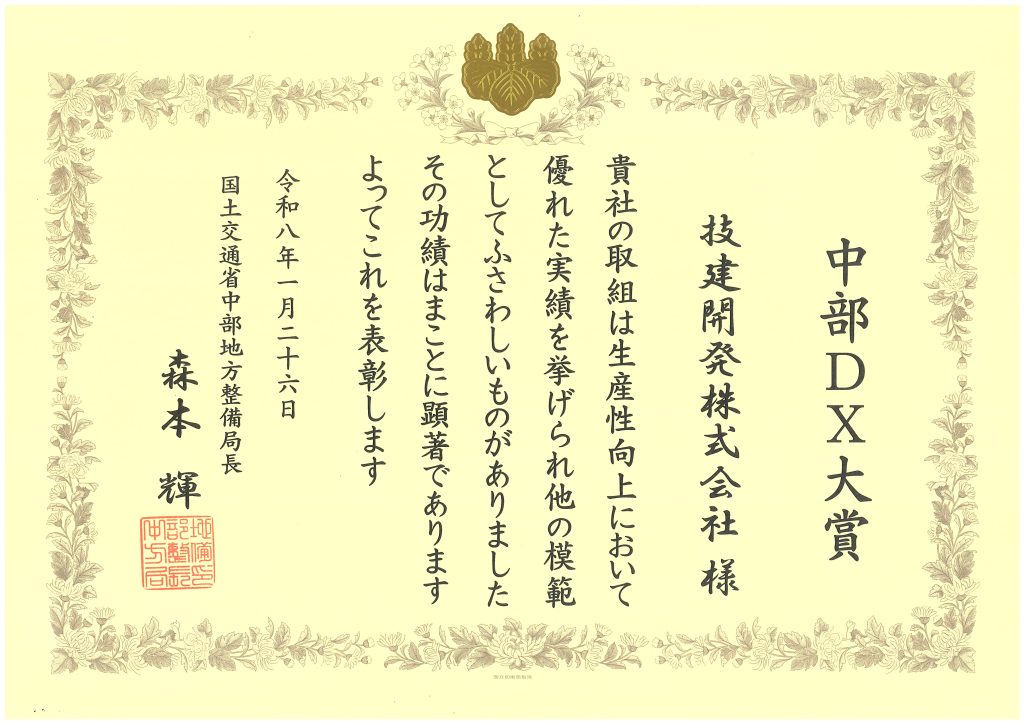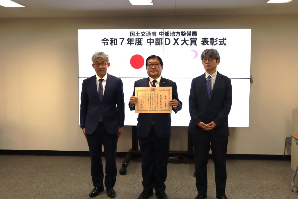 中部地方整備局では、中部地方整備局発注の工事・業務に限らず、インフラ分野の生産性向上や省力化に資する先進的なDXの取組を表彰対象に決定し、優れた取組を共有することで、中部からインフラDXのさらなる普及・拡大を図り、インフラの未来を変える現場の変革を推進していきます。